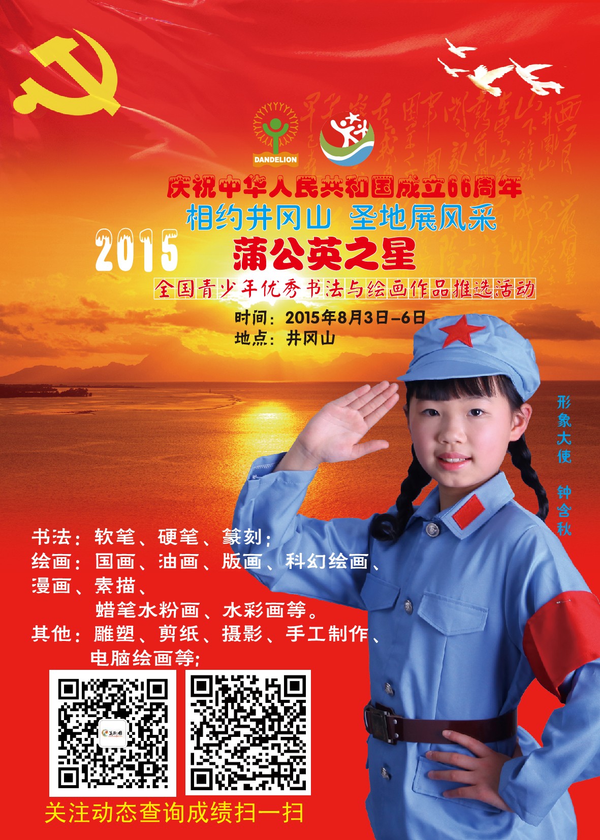 为庆祝中华人民共和国成立66周年,为了认真贯彻落实习近平主席“全国广大青少年,要志存高远,增长知识,锤炼意志,让青春在时代进步中焕发出绚丽的光彩”的指示精神,由中国文化交流促进会联合中国国家美术院、蒲公英(香港)儿童文化中心等单位共同组织举办的“相约井冈山·圣地展风采-第二届蒲公英之星全国青少年优秀书法与绘画作品推选活动”将于2015年8月3日—6日在井冈山隆重举行。